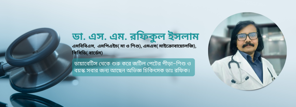 আইবিএস সহ যেকোনো জটিল পেটের পীড়া,জন্ডিস, ফ্যাটি লিভার , দীর্ঘ মেয়াদী জ্বর , পেট ফোলা , পেটের ব্যাথা, গ্যাস্ট্রিক আলচার, পুরাতন ডায়রিয়া ডিসেন্ট্রি , অ্যাজমা, শিশুর পুষ্টিহীনতা, শিশু ও বয়স্কদের নিউমোনিয়া, এজমা, বয়স্কদের ডায়াবেটিস, ব্লাড প্রেসার, অ্যালার্জি , হাইপারটেনশন ইত্যাদি সমস্যার স্বাভাবিক চিকিৎসা ছাড়াও বৈজ্ঞানিক গবেষণার ভিত্তিতে সকল বয়সের সর্বজনীন সুস্থতার ব্যবস্থাপত্র দিয়ে থাকেন , ব্যাখ্যা করেন , রোগীকে বুঝিয়ে দেন , রোগীর সন্তুষ্টি আর স্বস্তির ব্যাপারে সচেতন আর আন্তরিক থাকেন – ডাঃ রফিক।